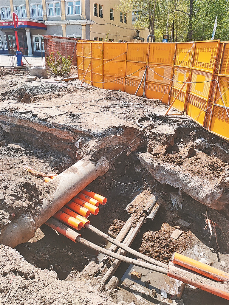 帮办记者同物业工作人员一同来到施工单位办公室,记者看到楼上写着“龙建六公司,东三环五标段”的字样。施工单位负责人说:“这地方水、电、气、供暖都施工过,到底是谁把(排水)管子挖断了,我也不知道。因为施工,外面整个排水管线已经全废了,就算没挖断也排不出去。新(排水)管线正在建设,大概40天能建好。但我们看图纸发现没留接口,和小区的管线连不上。”