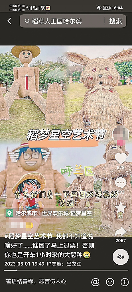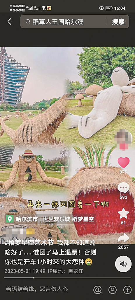 记者采访时,恰好有两名居住在附近的阿姨正在此处遛弯,她们表示,平时经常来这里散步,“五一”前几天这里被封上了,然后收门票19.9元才能进。“‘五一’期间还有不少外地人来这里,走的时候都不太满意,很失望,都说上当了。”记者在短视频平台上看到不少网友留言表示:“视频宣传是别的城市的,这里就是一个不大的公园放了几个稻草人,一点都不好。”“完全不是视频里那样的,从进去到出来只有十分钟。”