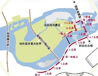 音乐公园广场-友谊西路-防洪纪念塔-滨洲铁路桥-警备街-风景街-太阳岛青铜钢琴