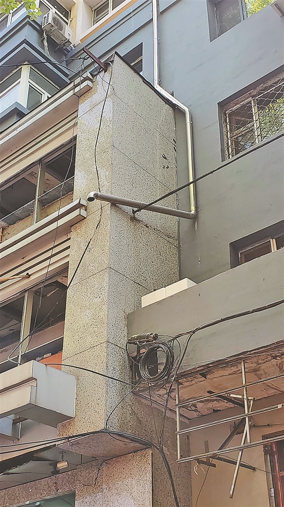 记者在工部街一侧看到,此处的排水管确实没有落地,有的直接从一楼商铺的牌匾上探出头来,有的从3楼阳台上伸出。而且在新换的排水管下方,之前白色硬塑料的旧排水管并没有被拆除,处于破损状态。在工部街与经纬十一道街交口处,也有一根悬在楼外的排水管,下方有一团缠绕的电线和网线。