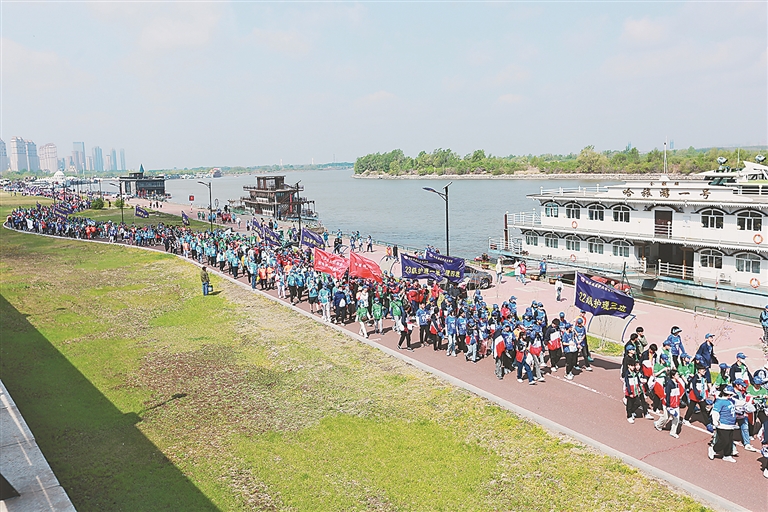 蓝天,白云,映着展翅翱翔的江鸥,在长长的徒步队伍中,有头发斑白的长者、有咿呀学语的幼童;有来自机关的干部、有来自学校的学生;有志同道合的社会团体,还有自发参与的市民。他们打卡美景,一路欢歌而行,成为路途中一道独特的风景线。经过近2小时的徒步,人们开始陆续抵达终点。