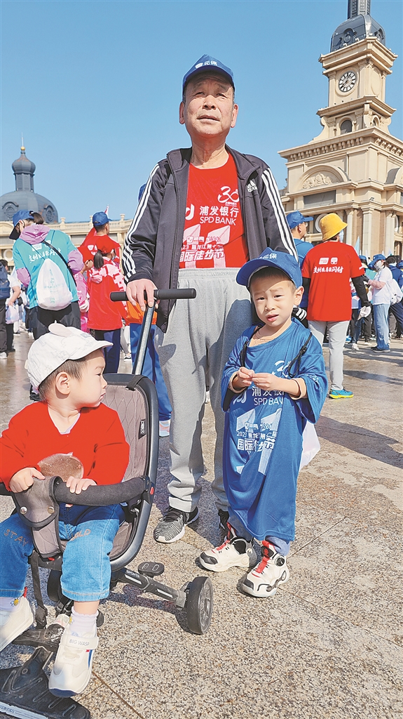 “这是我的两个孙子,小的1岁半,大的3岁半。”邵大爷一边说一边看着孩子。只见小孙子正坐在婴儿车里四下张望,对身边不停穿梭的人群很是好奇,大孙子则头戴蓝色太阳帽,身穿徒步活动的短袖T恤,身后还背着白色小包,一副小户外运动专家的样子。“今天我们是一行四人,孩子爸爸领我们来的,他给我报的名。”邵大爷说,他平时就爱户外运动,在公众号上看到此次徒步活动后,邵大爷就催儿子快点报名,“昨天晚上下雨,我还担心今天天不好呢,一早起来拉开窗帘一看,这天也太好了,太适合徒步了。”
