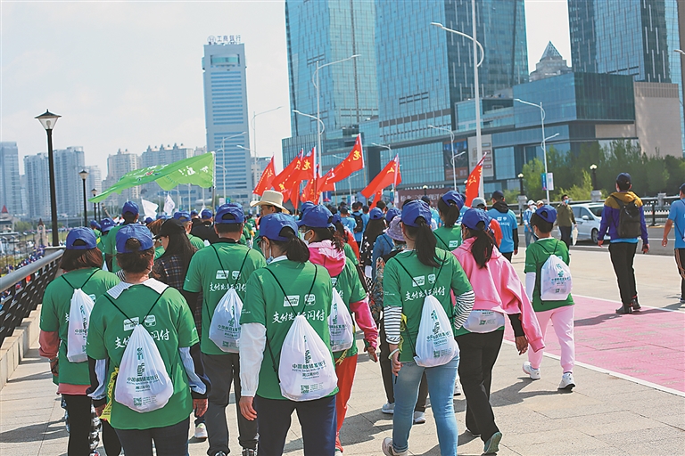 13日上午,2023黑龙江国际万人徒步节现场,每个参与徒步节活动的市民都身背装备包,形成一道独特的风景线。当天邮储银行黑龙江省分行不仅为本次徒步节提供万个装备包,还为现场参与市民派发满减优惠券。