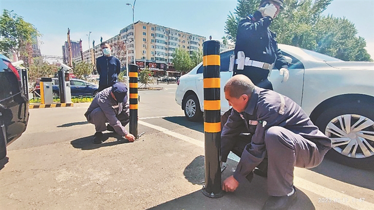 生活报讯 (记者王萌文/摄) 17日,本报“哈市红旗大街与长江路交口运通汽车销售公司私设挡车杆 圈占‘自用停车场’?”的报道,受到主管部门关注,当天,哈尔滨市公安局交警支队南岗大队辖区负责人来到现场,责令涉事单位对自建停车场进行了拆除。