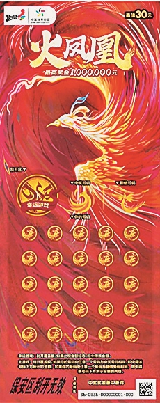 生活报讯 (杜昉) 日前,体彩即开型彩票顶呱刮“火凤凰”上市,在游戏规则上采用找奖金数字+数字匹配玩法,最高奖金100万元。