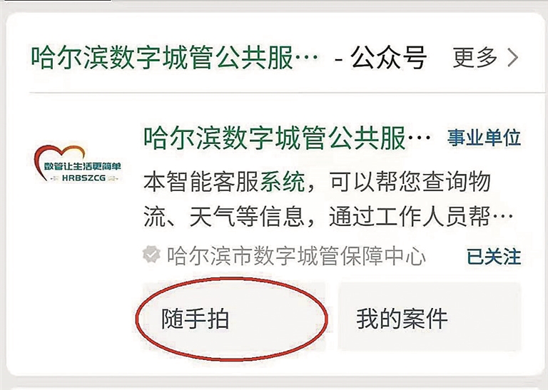 市民可通过微信搜索“哈尔滨数字城管公共服务平台”后,在公众号主页右下角“城管业务”中选择“随手拍”模块,按照受诉提示要求,填报相关问题信息,提交后由平台受理人员负责交由哈市城管局相关部门整改落实并跟踪办理,最终办理结果将通过微信向投诉市民反馈。