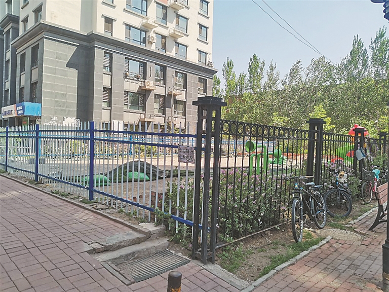 生活报讯 (记者赵政府文/摄) 日前,哈尔滨市南岗区枫蓝国际小区居民反映,位于小区内的龙成幼儿园圈占了小区内的公共绿地,居民向物业、教育部门反映后都没有解决。经查询得知,这个幼儿园竟然没有办学许可。