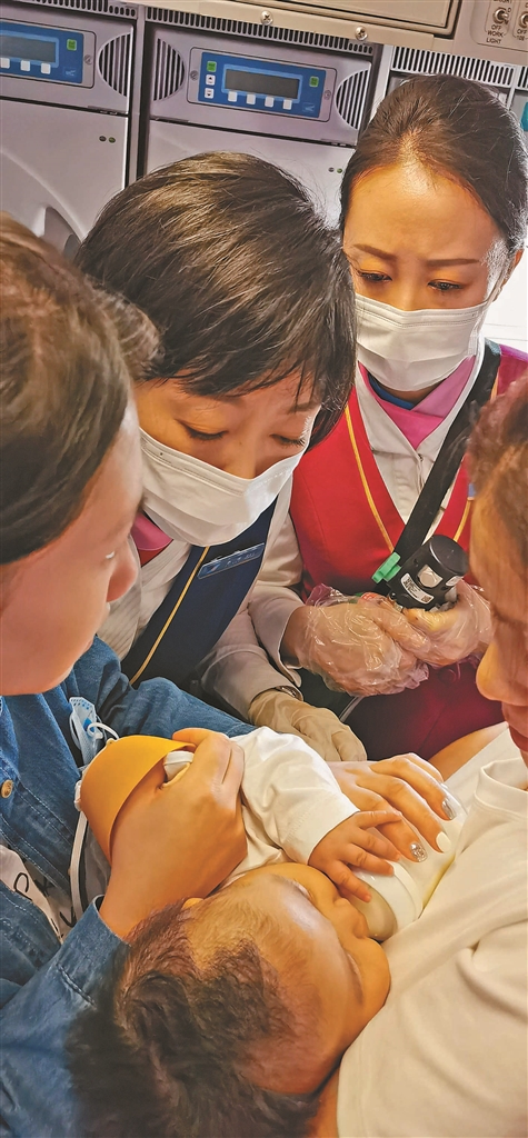 27日8时10分,南航黑龙江分公司的CZ6285航班在哈尔滨起飞。9时25分左右,乘务员看到两名女士抱着婴儿始终在客舱中站立,面色焦急,便上前询问。乘客表示,孩子刚喝完奶,应该是呛奶了。但乘务员看到婴儿的嘴唇已经变紫,意识到问题严重,立即将情况报告给乘务长和机长,同时通过机上广播寻找医务工作者。
