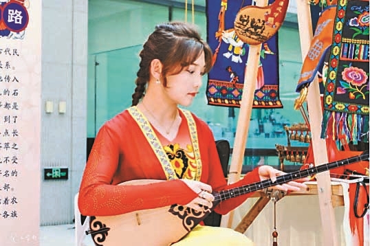 那边,哈萨克族同学演奏起冬不拉。可爱的蒙古族娃娃笔筒、精致的朝鲜族人偶、颜色鲜艳的满族手舞龙、蒙古族马头琴、朝鲜族装饰画……琳琅满目的精美展品,尽显各民族灿烂的非物质文化。现场参观的汉族同学试穿起少数民族服饰,“沉浸式”体验不同的民族风情。