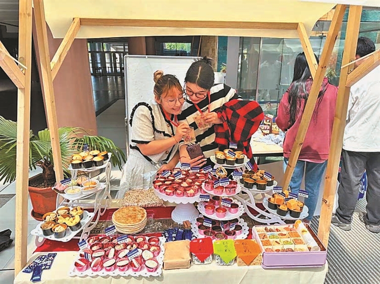 “手抓饭是乌孜别克族最出名的美食,每年3月21日是我们的开春节,我们会用17种豆类熬粥,以此来庆祝。”乌孜别克族同学热福凯提,自豪地介绍着自己的民族文化和美食。从回族的甜三角,布依族的豆沙粑,到壮族的淮山饼,蒙古族的撒子,色香味俱全的糕点吸引了一大批“品鉴家”。