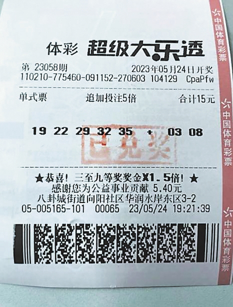 董先生的中奖彩票是一张追加投注5倍的单式票,第23058期二等奖单注奖金16.39万余元,追加投注每注多得奖金13.11万余元,每注还可多得二等奖派奖奖金9.09万余元,二等奖单注总奖金38.6万余元,5注总奖金合计193万元。