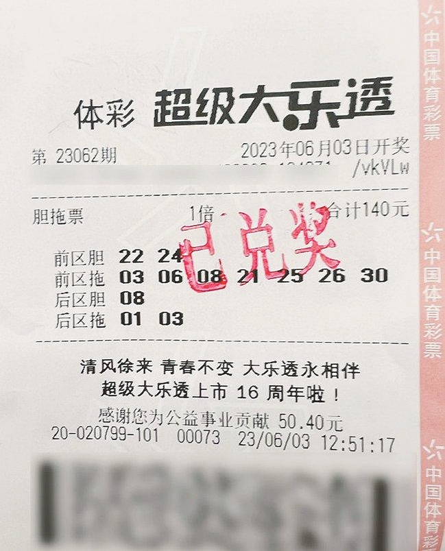 生活报讯 (一兵) 3日,体彩超级大乐透第23062期前区开出号码“06、08、22、24、30”,后区开出号码“01、08”。上海的关女士中得一注一等奖,奖金716万元。她中奖的方式和近期我省绥化大乐透千万大奖得主如出一辙——胆拖投注。