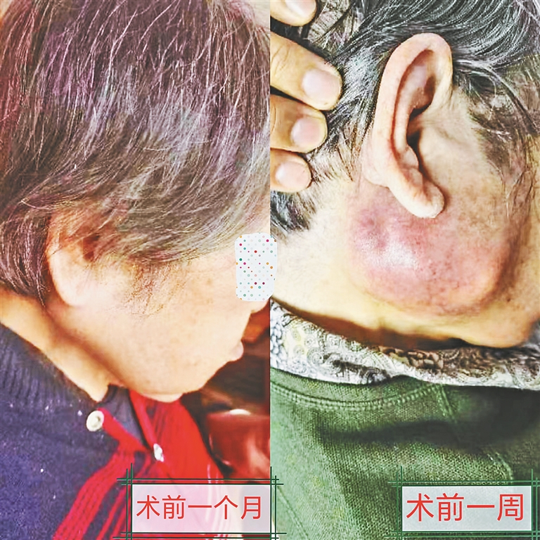 生活报讯(记者周琳) 耳朵后边长了个包,以为是腮腺炎,不到一个月后长到鹅蛋大小,一查竟是恶性肿瘤……近日,哈医大四院松北神经外科颅底团队在赵振环主任带领下,联合口腔颌面外科、整形美容科、麻醉科、手术室等多学科,成功为一位90岁老人切除了侵犯颅底的巨大腮腺恶性肿瘤。
