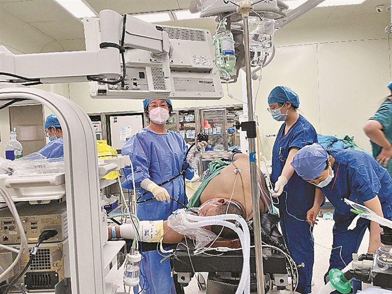 生活报讯 (记者王秋实) 近日,哈医大一院消化内科唐印华教授团队联合麻醉科、心内科、肿瘤腔镜外科多学科合作,成功为一名体重304斤的27岁男子完整切除食管部位的早癌。