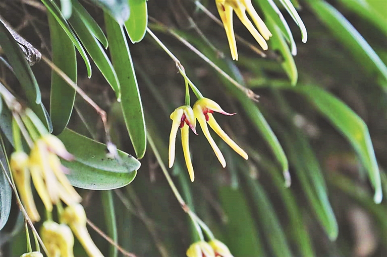 卧龙卷瓣兰为多年生草本植物,附生于海拔1600-1700m的针阔叶混交林树干上。每年9、10月开黄色的花,由3个鸭嘴形的花瓣组成,花心呈紫红色,叶片呈倒卵状长圆形。经卧龙保护区2022至2023年的持续野外调查,初步发现3个居群,数量较为稀少,保护区也将制定相关的保护策略。根据植物所对川西的广泛调查,确认卧龙是其目前所知的唯一产地。