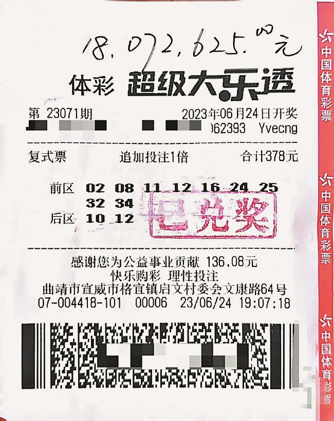 6月24日晚,云南曲靖宣威中出大乐透一等奖1注,中奖彩票是一张“9+2”复式票,除命中当期追加一等外还命中若干小奖,奖金共计1807万多元。