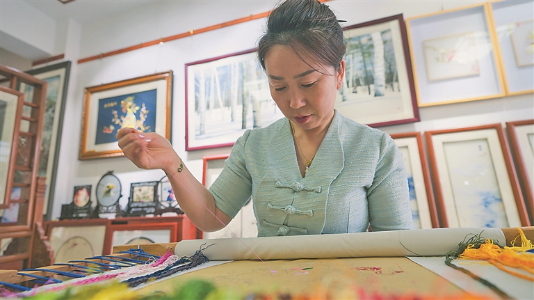 在北安市乌鱼绣传承展示馆内,四五个身着红色旗袍的绣娘正聚精会神地俯身听讲,一身淡雅蓝色旗袍的王春艳端坐在绣架前,只见她右手大拇指与食指拈着细长的绣花针,小拇指则顺势勾住未完工作品中延伸出的蓝色丝线。随着绣花针在左右手间传递、上下翻飞,绣布上一个个画面逐渐清晰,勾勒出的作品仿佛“活”了起来。正在向绣娘教学的王春艳是黑龙江省非物质文化遗产——乌鱼绣的传承人。近日,记者走近王春艳,听她讲述她的技艺传承故事。