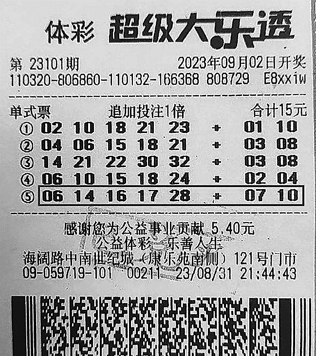 据悉,小韩在当地一家公司上班,购彩一年多,喜欢随机投注体彩大乐透,尽管不经常研究,不过他每次购彩都喜欢追加投注,此前虽然没中过什么大奖,但他一直保持着这样的投注习惯。8月31日晚,他在公司加班结束后到附近的一家体彩网点,按照习惯追加投注打了一组5注15元的大乐透单式票。由于投注时间较晚,小韩实际购买的是9月2日开奖的大乐透第23101期,当期中奖号码为“06 14 16 17 28+07 10”,他的第5注号码一击命中,由于采用追加,顶格中出1注追加投注一等奖,奖金高达1800万元。