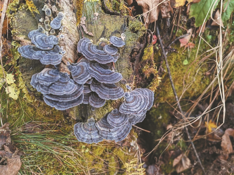 顺着鱼塘旁边的小道向林中走去,王滨发现旁边的小山有可以徒步上山的小路,“这林子里有野蘑菇长得像灵芝,非常难得一见。傍晚我们在林场的小路上悠闲地转转,意外发现山顶上的雨后彩虹,太美了。”