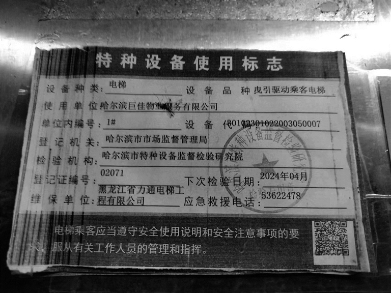 记者看到,电梯内张贴了“特种设备使用标志”,上面明确显示“下次检验日期:2024年04月”。随后,记者跟随居民来到位于井街18号院内的哈尔滨巨佳物业服务有限公司买卖物业站,张站长表示:“每次接到报修电话,我们都会第一时间联系电梯维保公司进行抢修。维保公司是我们公司通过正规招投标程序确定的,年检也是通过相关部门正规检验的。近期频发的故障原因我们还在排查中,每次发生故障,维修人员只要重新启动就能恢复运行。目前维保公司已经邀请了行业内的权威维修专家,尽快到达现场进行检修。”