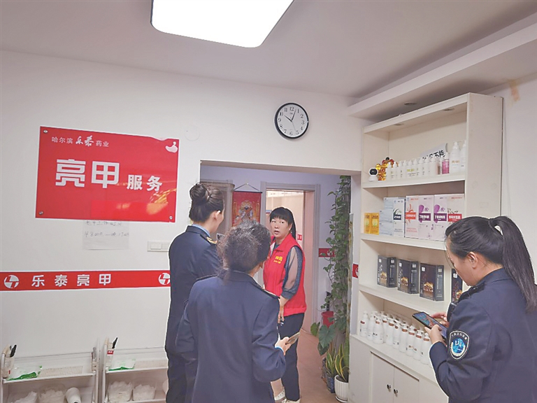9日,记者跟随南岗区卫生健康局卫生监督所执法人员来到闽江小区的“乐泰亮甲”,执法人员进行了现场检查。据消费者介绍,平时店里一大早就会聚集四五位前来治疗的客人,而检查时店里一位客人也没有,只有一名工作人员。