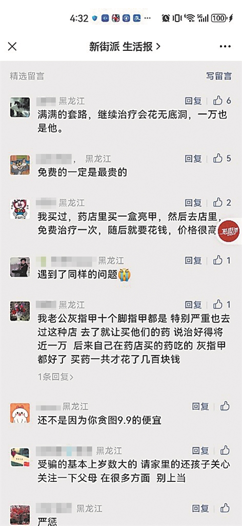 不少网友也在生活报官微进行留言,网友柠朵说:“我买过,药店买一盒‘亮甲’,然后去店里免费治疗一次,随后就要花钱,价格很高。”网友紫霞说:“我老公灰指甲也去过这种店,去了就让买他们的药,说治好得将近一万。后来自己在药店买的药,灰指甲都好了,一共才花了几百块。”网友远洋说:“满满的套路,就是无底洞。”