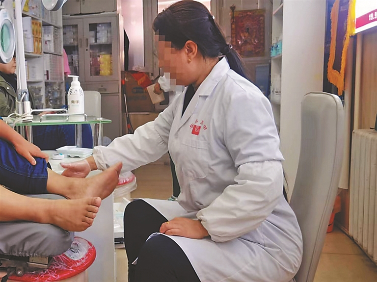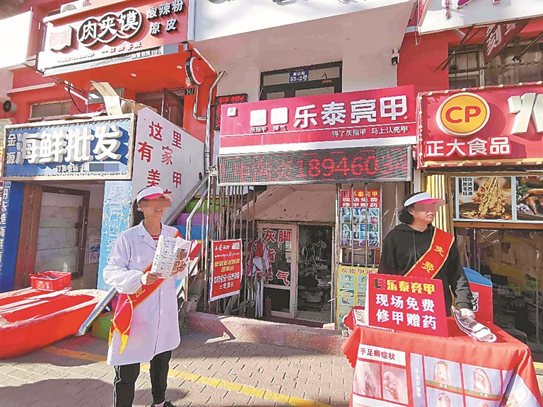 记者当日在道外区太平桥路段一家“乐泰亮甲”门店前看到,两位女工作人员身披绶带进行宣传,宣称可以领取赠品和免费体验;一看到有人路过,她们更是热情推介。记者走进店内,发现有两位顾客正在泡脚,两名穿着印有“乐泰亮甲”字样白大褂的女工作人员在店里忙活。看到有人上门,两位工作人员非常热情地招呼记者坐下,表示可以免费检查。