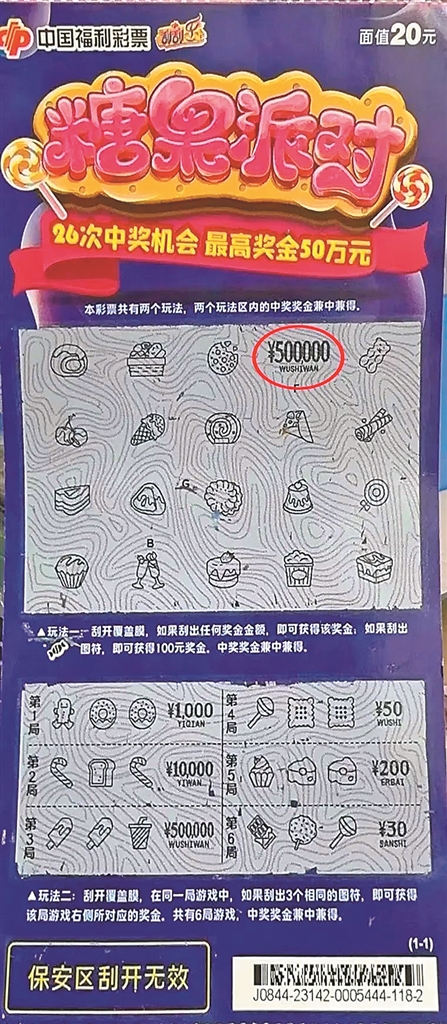 中奖当天正值假期,周女士和朋友一起逛街,顺路来到附近的投注站。进店后,周女士先买了一张面值20元的“耀出彩”刮刮乐喜中奖金30元,随后换购了一张面值30元的“喜相逢”刮刮乐,接着又花20元买了一张“糖果派对”刮刮乐,在“玩法一”的第一行就刮出头奖50万元。“非常感谢福彩送来的惊喜,今后我还会继续购买福彩,为公益出力,为生活添彩。”周女士说。