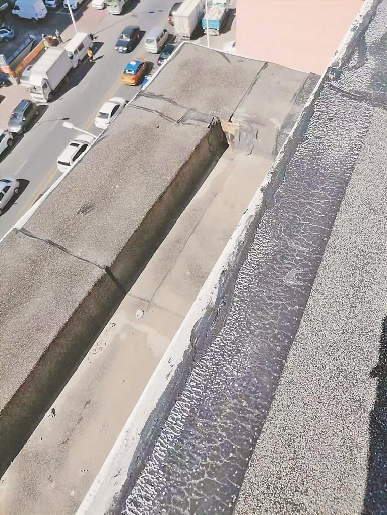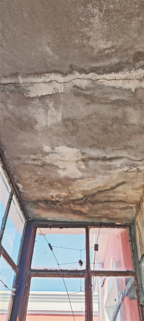 “小区‘旧改’已经进行3年了,头一年做的楼体保温,2022年做的屋面防水,今年主要是地面和一些收尾工作。”魏先生介绍,他所居住的802室位于顶楼,临街的凉台大约4平方米。没推开凉台门之前,记者就闻到一股刺鼻的霉味,推开门后这种气味扑面而来、更加浓烈。记者看到,凉台棚顶有明显被水浸泡过的痕迹,颜色深浅不一的水渍布满整个棚顶,而且有三处明显的裂痕。“没‘旧改’前我这凉台也漏水,原以为‘旧改’后会有好转,没想到还是一样。每到下雨天棚顶的两三个地方就会往下滴水。”