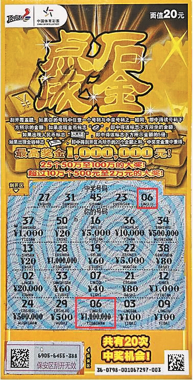 小韩平常热衷于体育彩票,尤其喜爱玩20元面值的顶呱刮即开票。10月2日晚上,小韩下楼散步,发现一家新开业的体彩投注站。他选了七八张20元面值的“点石成金”刮了起来。