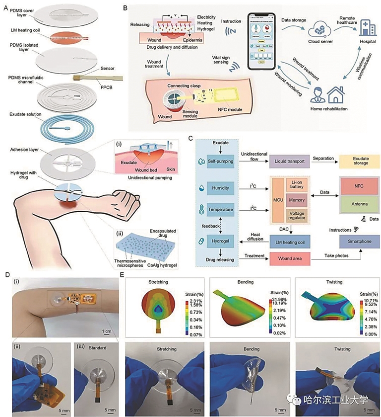据了解,机器人技术与系统全国重点实验室、机电学院任玉坤教授团队在智能可穿戴医疗设备方面取得重要进展。该成果实现了伤口渗出液管理、传感器监测、闭环治疗和柔性电路模块的高度集成,为慢性伤口的新型监测与治疗提供全新思路,在可穿戴医疗器械领域具有重要应用前景。