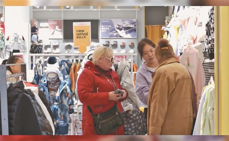 在绥芬河商业中心,各种品牌的时尚服装、鞋包、装饰品等琳琅满目,俄罗斯游客纷纷挑选心仪的商品。俄罗斯游客伊格里说:“来绥芬河购物,商品物美价廉,还能吃到中国美食,一切都非常愉快,很赞。”