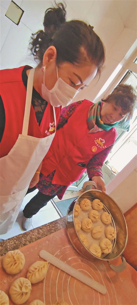 王桂芝和同伴们正有说有笑地在灶台前忙活着。发面、调馅、洗菜、包包子,几人配合默契,不一会儿便蒸了两大锅包子。刘洋刚和志愿者办完手续一进门,就闻见香味满足地说:“王姐,你蒸的包子真香,每次你蒸包子,我一口气都能吃仨。”“喜欢吃就好,等天儿凉了,有时间来,再给你多包点放凉台,你想吃了蒸上就行。”王桂芝笑着对刘洋说。