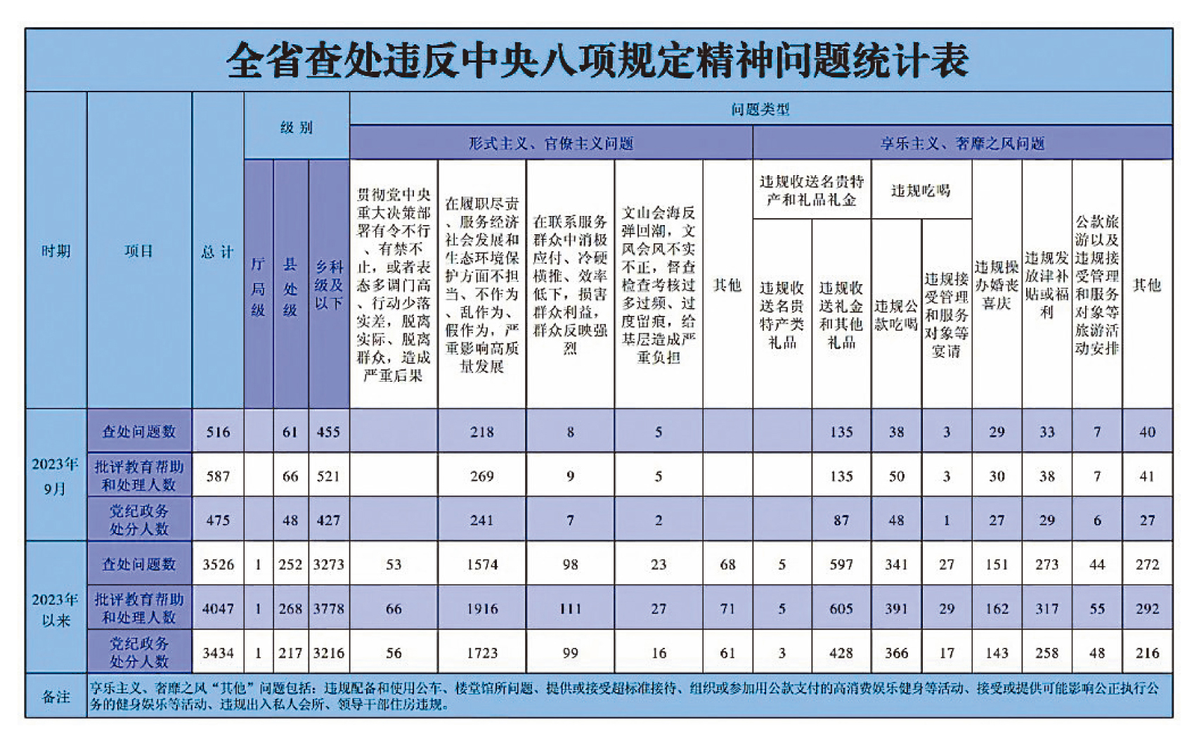 生活报讯 (记者仲亮) 2023年9月,全省纪检监察机关共查处违反中央八项规定精神问题516起,运用“四种形态”批评教育帮助和处理587人,其中党纪政务处分475人。