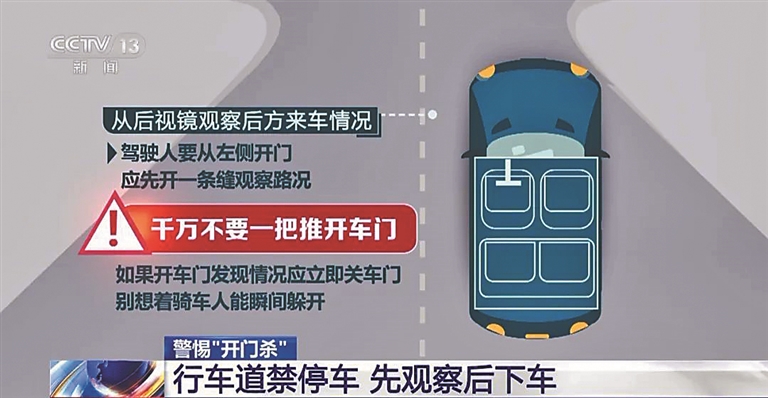 下车开车门,这个看似简单的动作,如果驾乘人员不注意,极有可能酿成事故,危害到自身和他人的生命安全,俗称“开门杀”。今年7月,广东中山一女子驾驶电动车时,路边一辆小轿车的司机没有留意车外情况就开门下车,女子避让不及撞上车门,连人带车倒地。女子因头部着地造成颅脑损伤,最终抢救无效身亡。