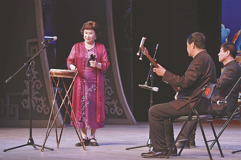 国家级代表性传承人邱淑华和黑龙江省群众艺术馆工作人员共同创作并表演了东北大鼓《雁归来》;首届中国曲艺牡丹奖“表演奖”获得者、郝派西河大鼓国家级代表性传承人郝秀洁则为大家带来西河大鼓名段《唐明皇观灯》;刘兰芳表演了奉派东北大鼓《马跳檀溪》,在观众的热烈掌声中又返场带来评书《岳飞传》片段,将演出推向高潮。最后,非遗传承人们演绎的东北大鼓群唱《鼓韵长馨》弦音动听、鼓板嘹亮,在现场观众经久不息的掌声中,演出落下帷幕。