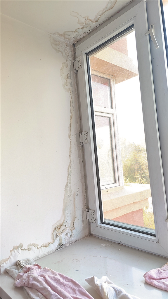 “房子在5楼,并不是顶楼,这个漏水问题已经困扰我很多年了。”陈女士无奈地说。记者发现,在白色窗框周边有明显的水渍,由缝隙向外延伸,在窗框与墙体的衔接处,由于常年的漏水已导致墙皮出现大量开裂脱落的现象。“由于这个房子已经多年闲置,起初我都没发现漏水的问题,后来我每次来打扫时发现地面总有干了的水渍,从那时才注意到水是从窗户这漏进来的。这个问题我已经找了很多年都没有解决,现在只好在窗台处铺满毛巾,以免漏水流到屋内。”