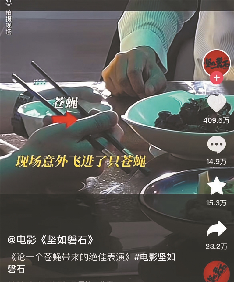 比如,其短视频账号中有一条标题为“论一个苍蝇带来的绝佳表演”的视频,张国立饰演的“郑刚”在餐桌上训斥“苏见明”时,意外闯入一只苍蝇,张国立即兴发挥大喊一句:“哪来的苍蝇!”记者看到,这条视频收获了409万的点赞、14万的留言、23万的转发。然而留言中不少人指出:“专门去电影院看苍蝇,结果没出镜。”