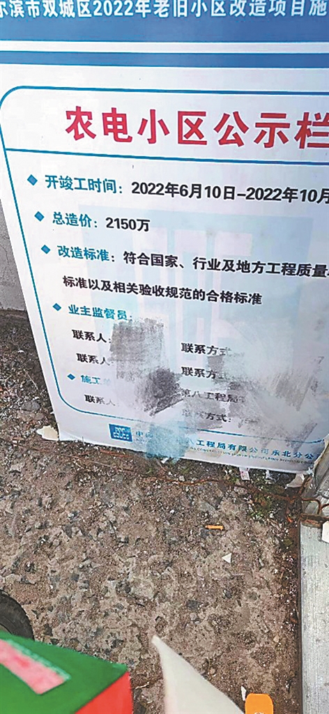 记者查看了农电小区的旧改公示板,上面显示开竣工时间为“2022年6月10日-2022年10月”,改造内容包括“沥青道路罩面、挖补、新建,室外给排水工程”等。