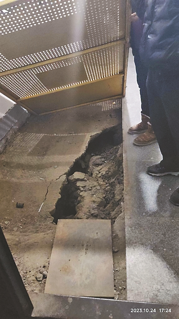 更让居民难以接受的是,楼道里竟然还有大坑!在居民的带领下,记者从3号楼4单元开始,一直走访到9单元,发现所有的单元门都大敞四开,过道也没完工。记者在5单元看到,楼内过道的路面被破开,铺了一层号石,没有抹水泥,上面还有一块铁皮围挡,在旁边留了一条半米宽的水磨石地面,供居民上楼使用。其他单元也是同样的情况,有的围挡下面还没来得及填实,能看到大坑。有的单元连过道都没留,居民进出要走铁皮和木板搭起来的跳板。