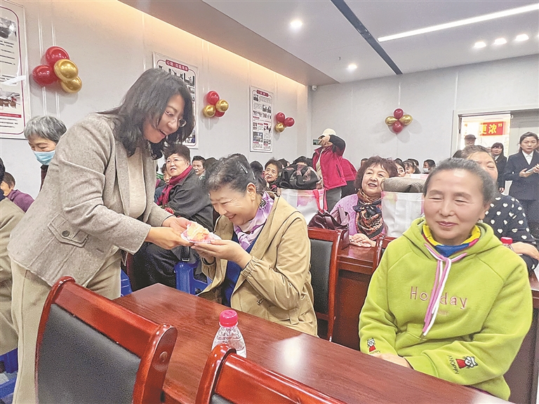 活动当天,爱心企业人士和志愿者们纷纷为出席的老人送去了祝福。随后伴随着音乐响起和热烈的掌声,写着“孝满金秋月,敬老情更浓”重阳节蛋糕送入现场,嘉宾们将这份甜蜜传递到幸福的老人手中。