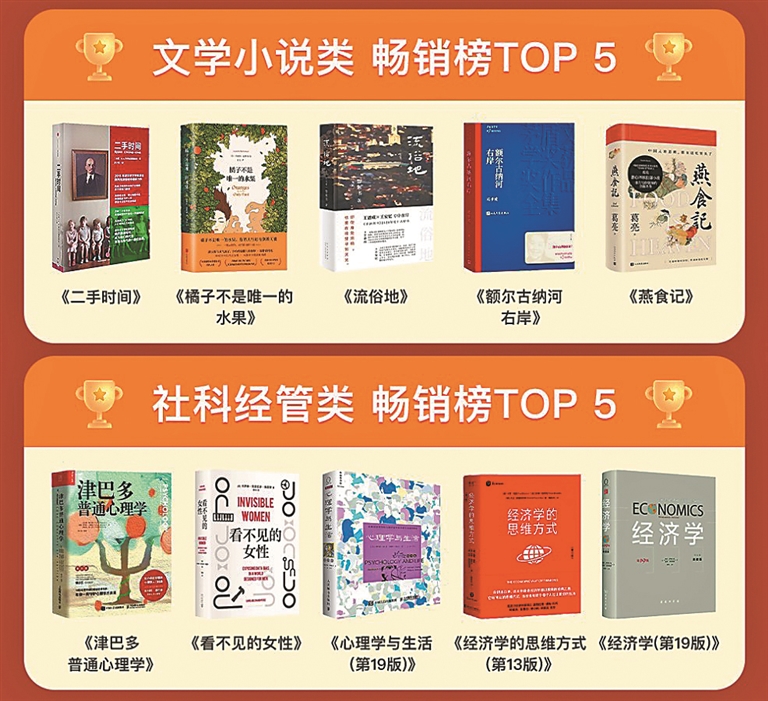 与此同时,数据显示,社科经管类书籍成为黑马。以《津巴多普通心理学》《看不见的女性》《心理学与生活(第19版)》《经济学的思维方式(第13版)》《经济学(第19版)》等为代表的社科经管类书籍,订单占比达到21.6%,仅次于文学小说。本季活动中,文学小说类书籍依然是销售最多的品类,占比47.6%,最受读者欢迎的前五名是《二手时间》《橘子不是唯一的水果》《流俗地》《额尔古纳河右岸》《燕食记》。