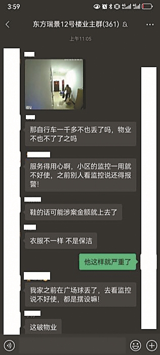 记者在小区业主群里看到,有的业主说家里前一晚换下来的油烟机放门口被盗,让物业调取监控帮忙查看,被告知未查到;有业主放家门口的鞋、平衡车、生活用品等等都被偷了,告诉了物业,却都是不了了之。更有业主直接在群里发出了家门口被盗的录像。