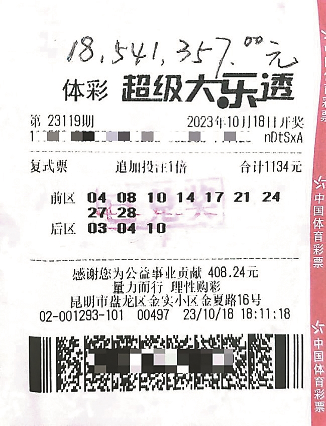 中奖的吴先生使用了9+3复式追加投注,购买了一张1134元的大乐透,没想到中得1854万大奖。吴先生说自己很激动,对奖金没做什么规划,只想到先把家里的房贷、车贷还清,其他的再做打算。