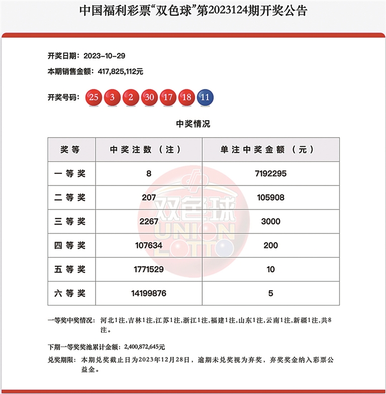 本期二等奖中出207注,单注奖金10万余元;六等奖中出1419万余注。本期销量4.17亿元,筹集公益金1.50亿元。下期一等奖奖池累计金额24亿元。