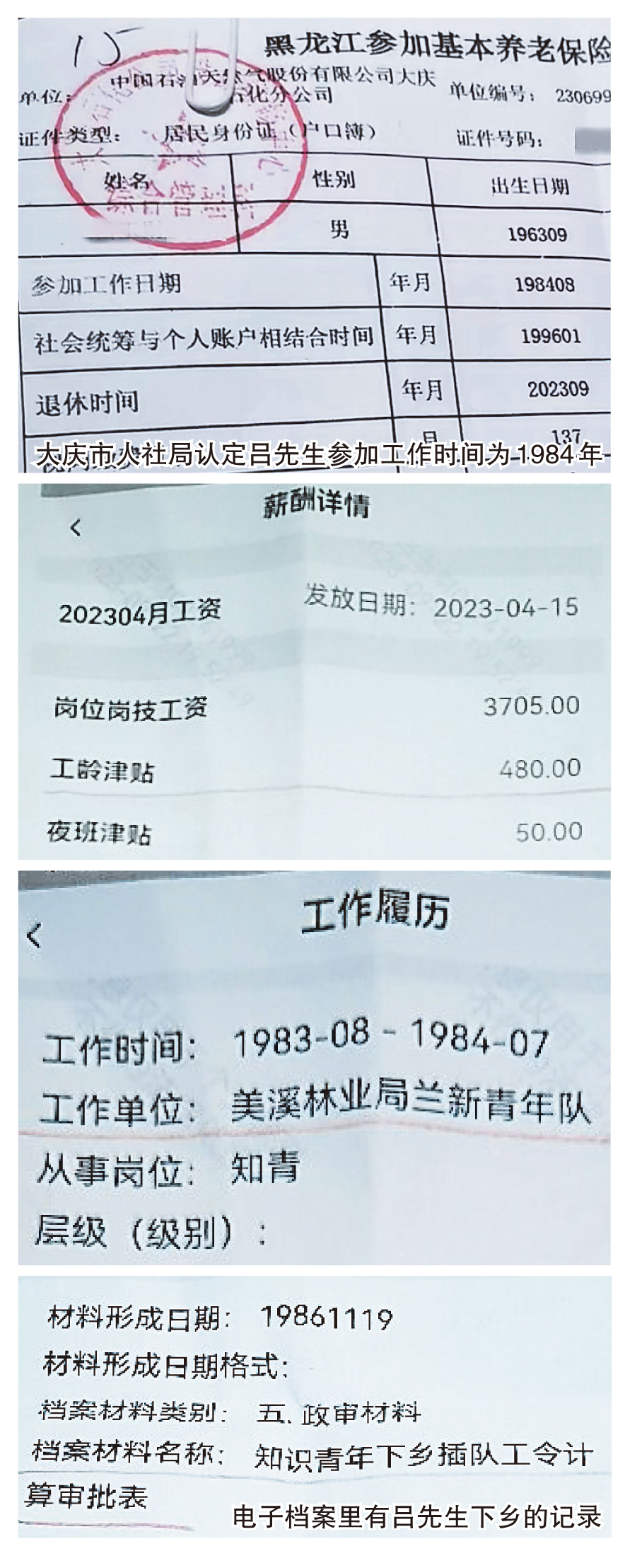 10月30日,记者在大庆市见到了吕先生。据他介绍,1983年8月至1984年7月,他在伊春市美溪林业局兰新青年队下乡;1984年8月,大庆石化公司(原大庆乙烯化工厂)到当地招工,吕先生被分配到化工一厂维修车间,一直从事钳工的工作。吕先生今年9月27日正式退休,工龄应为40年,但当他去单位取“基本养老金核定表”时发现,参加工作日期被认定为1984年,工龄被认定为39年。大庆市人社局在审核其档案时,没有找到他1983年8月至1984年7月下乡的“证明材料”,所以没有算那一年的工龄。