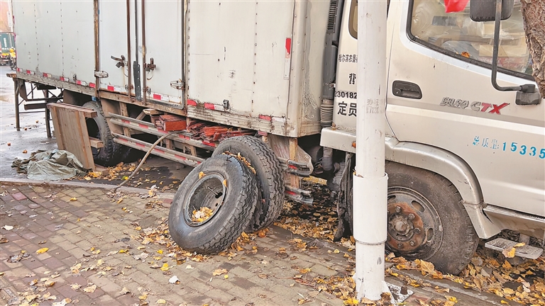 12时许,记者又随交警哈西大队民警来到新苗圃街看到,有两辆大型箱式货车停在路边。