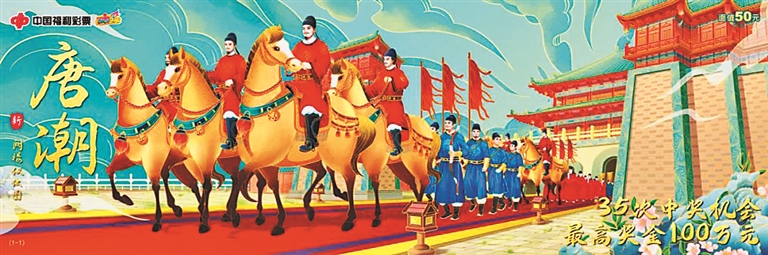 刮刮乐“唐潮-新阙楼仪仗图”延续了之前的国潮风格,色彩明艳、画工考究,细看之下,每位士兵的表情有所差异,既高度还原文物记载的历史场景,又贴近当下受众的审美。此外,为保持画面的完整性和美感,“唐潮-新阙楼仪仗图”将玩法区设置在彩票背面。玩法也很简单,刮开覆盖膜,如果刮出任何奖金金额,即可获得该奖金,中奖奖金兼中兼得,35次中奖机会,最高奖金100万元!