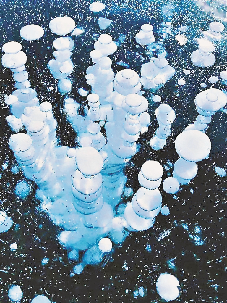 2日,漠河持续迎来降温天气,漠河观光游览胜地观音山景区内的莲花湖开始进入封冻期,大小不一的冰泡呈现在莲花湖面上。据景区工作人员介绍,冰泡湖奇观只会出现在寒冷地区,漠河莲花湖的冰冻气泡面积达三万多平方米,规模之大国内实属罕见。这位工作人员说:“湖中有机物质经过长期沉淀产生甲烷,甲烷不溶于水,会冻成各种各样的气泡。这种冰冻气泡不但好看,还可点燃,非常吸引游客。”