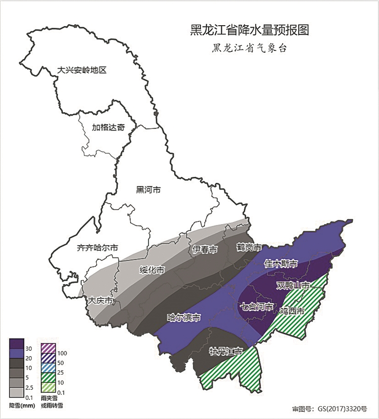 6日凌晨至早晨哈尔滨、七台河、鸡西西部、牡丹江西部雨夹雪转雪;6日上午至午后双鸭山东部、鸡西东部、牡丹江东部雨夹雪转雪。中东部地区有降水的同时将出现道路结冰。